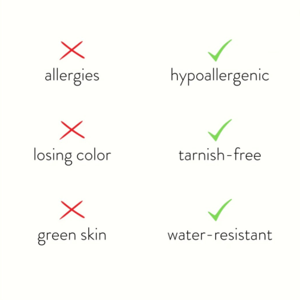 • Waterproof & Tarnish-Free Our jewellery won't fade or tarnish, ever.